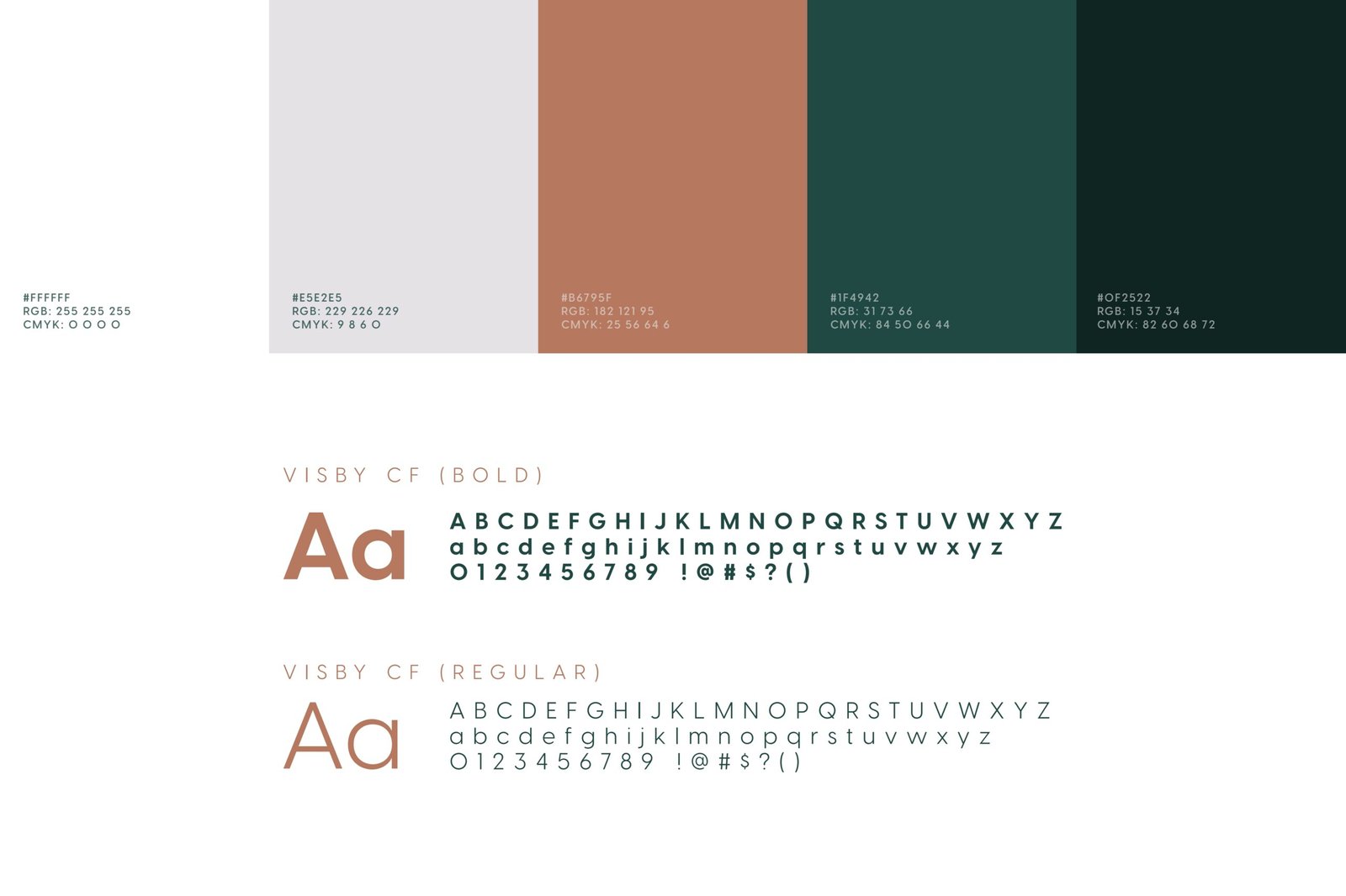 Visuals: Colour palette; font (Visby CF); brand patterns